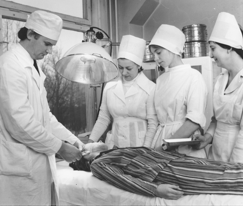 20. gs. 70. gadu beigas. Republikas apvienotā stomatoloģijas poliklīnika ar stacionāru Dzirciema ielā 20 (tagad šeit atrodas RSU Stomatoloģijas institūts). No kreisās: Andrejs Skaģers, nodaļas vadītāja Valentīna Kandaūrova, klīniskā ordinatore Rasma Ondzele un nodaļas medicīnas māsa (vārds un uzvārds nav zināms). No RSU muzeja arhīva