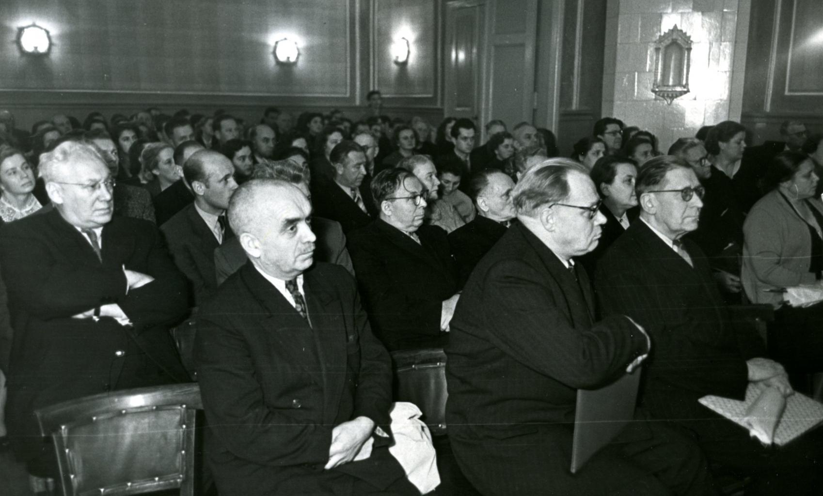 1950.–1960. gadi. No kreisās: 1. prof. Kārlis Balodis, 2. (2. rindā) Haralds Voskis, 3. prof. Kristaps Rudzītis, 3. (2. rindā) prof. Dominiks Kalvelis, 4. prof. Pēteris Gērke, 5. prof. Aleksandrs Bieziņš. Foto no RSU Vēstures muzeja krājuma
