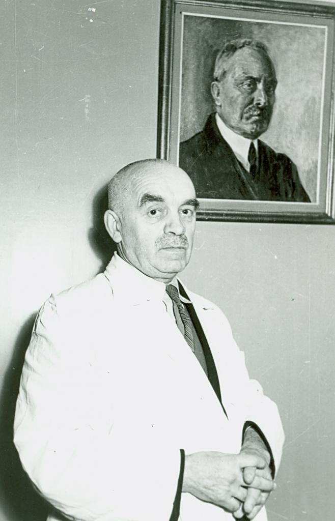 Prof. K. Rudzītis pie prof. Mārtiņa Zīles portreta (ap 1960. gadu). Foto no RSU Vēstures muzeja krājuma