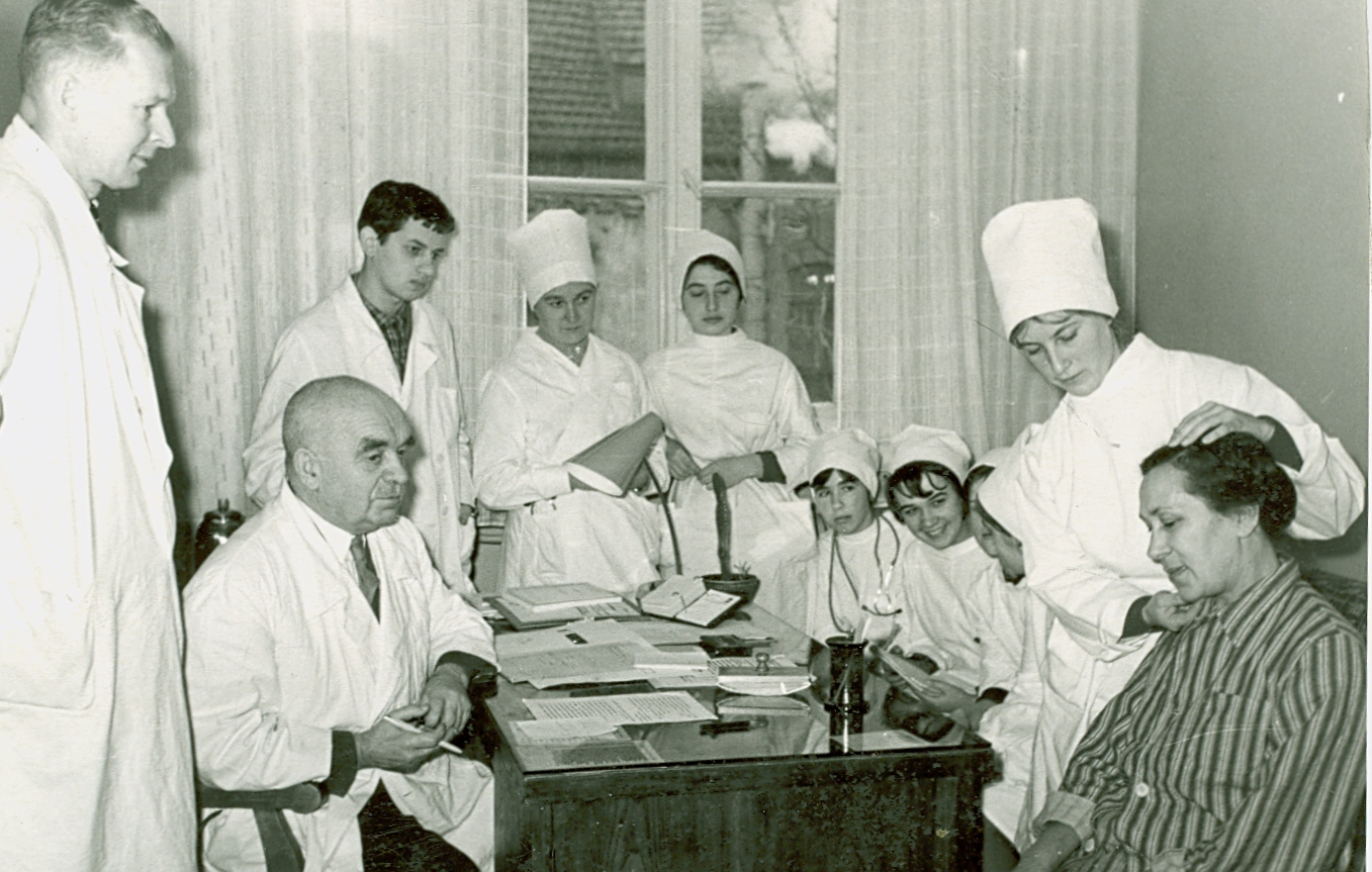 Nodarbību vada prof. K. Rudzītis (sēž 2. no kreisās), asistē doc. Agnis Štifts (stāv 1. no kreisās). Foto no RSU Vēstures muzeja krājuma