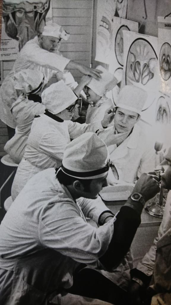 Otorinolaringoloģijas katedras kolektīvs ap 1975. gadu (prof. Gaudiņš – centrā). Foto no RSU Vēstures muzeja krājuma