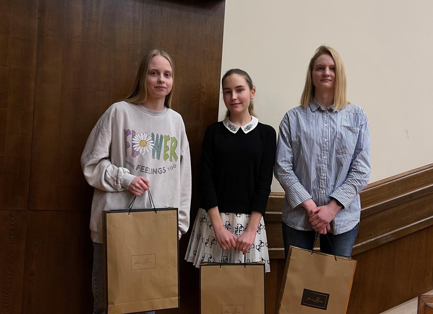 No kreisās: 1. vietas ieguvēja Madlēna Keiša no Aizkraukles novada vidusskolas, 2. vietas ieguvēja Elza Strumpe no Rīgas Valsts 1. ģimnāzijas un 3. vietas ieguvēja Patrīcija Nikola Svīrēja no Rīgas 84. vidusskolas