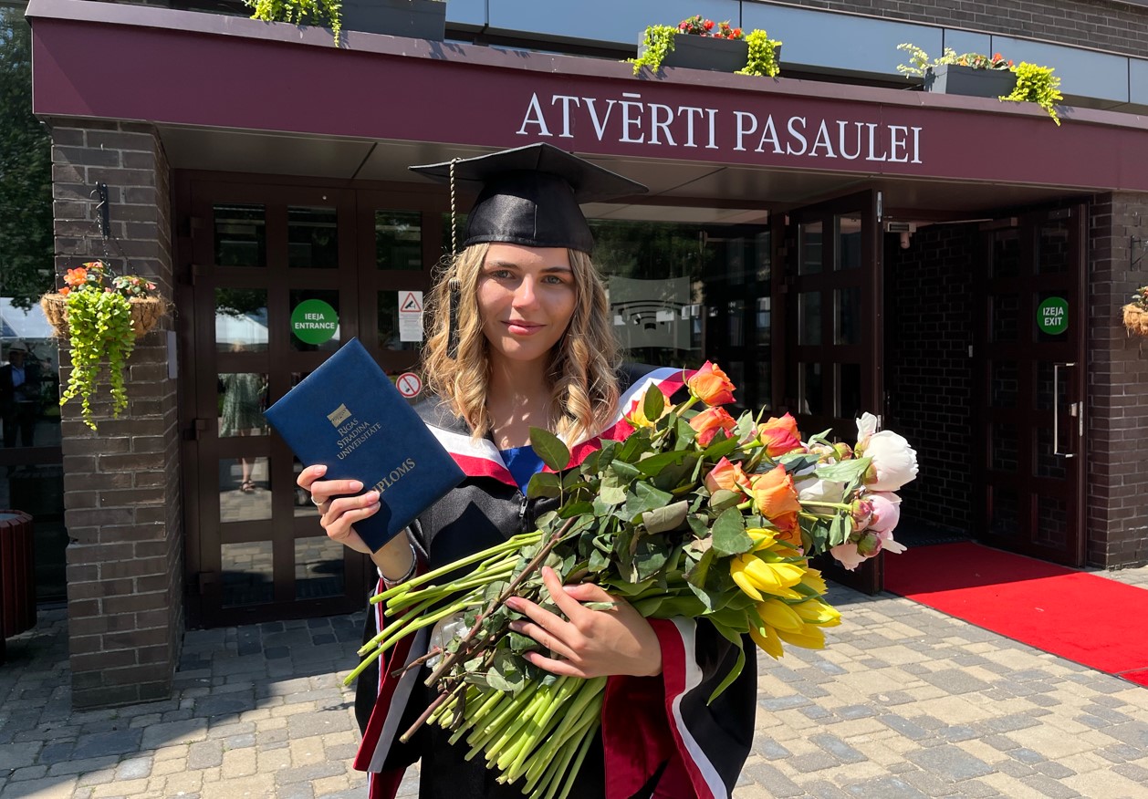 Anna O. M. Singelmanne pie RSU centrālās ēkas savā izlaidumā 2022. gada vasarā. Foto no privātā arhīva