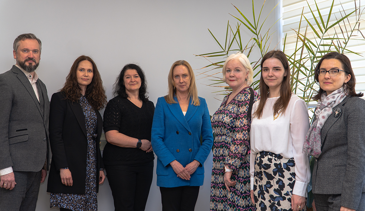 Absolventu asociācijas valde kopā ar izpilddirektori Paulu Jumīti. No kreisās: Haralds Plaudis, Ieva Šlēziņa, Liene Ņikitina-Zaķe, Egita Pole, Ilze Konrāde, Paula Jumīte, Ruta Siliņa
