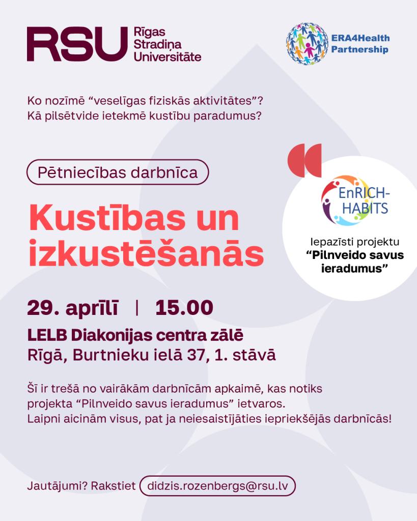 Darbnīcas tiek rīkotas ar mērķi ne tikai izglītot iedzīvotājus par veselīga dzīves veida aspektiem un vides ietekmi uz fiziskajām aktivitātēm, bet arī sniegt iespēju piedalīties inovatīvā pilotpētījumā.