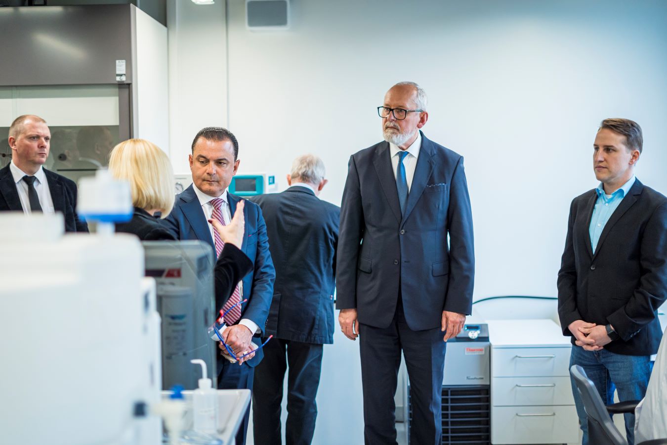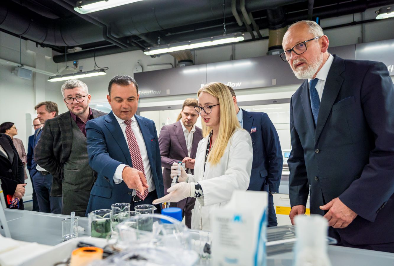 Veselības ministrs Hosams Abu Meri un ministrijas pārstāvjiem kopā ar RSU rektoru prof. Aigaru Pētersonu apskata Farmācijas studiju un pētniecības centru