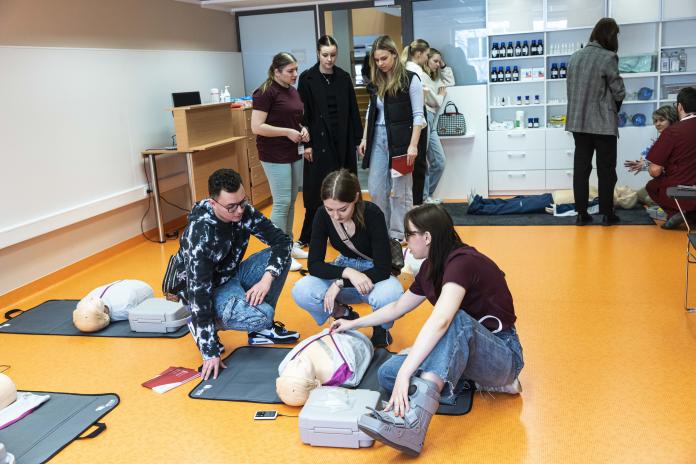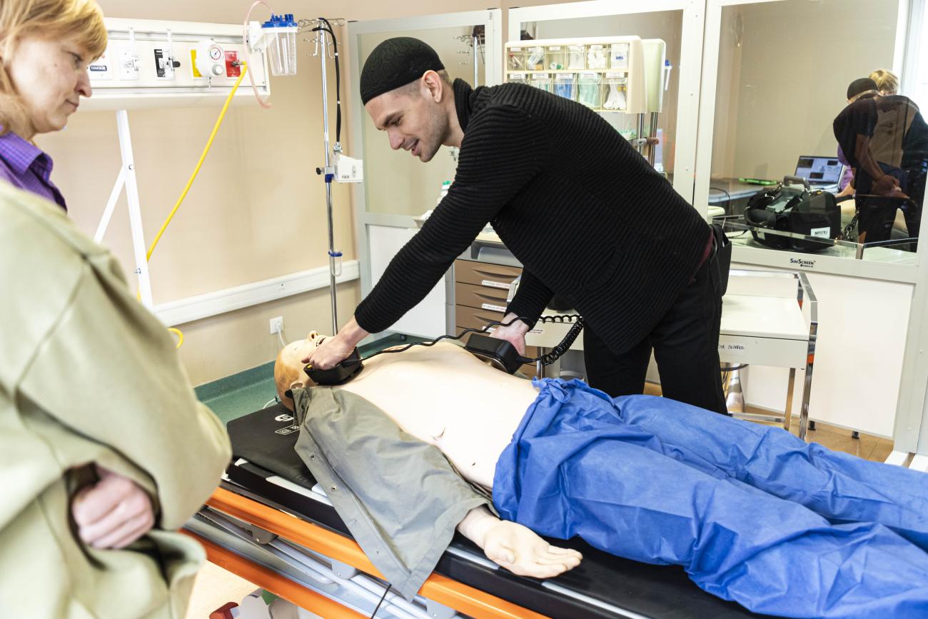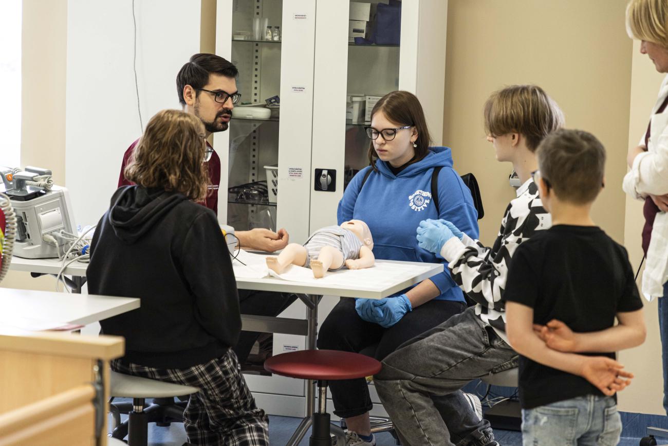 Medicīnas izglītības tehnoloģiju centrā skolēniem bija iespēja izmēģināt dažādas medicīniskās manipulācijas ar simulācijas iekārtām – injicēt zāles manekena rokā, izmēģināt prasmes ķirurģiskajā šūšanā un atdzīvināt pacientu, veikt laparoskopiskās operācijas –, bet veselības aprūpes studiju virziena apmeklētāji varēja iepazīties ar ultrasonogrāfijas simulācijām, iztestēt savas prasmes dažādos spēka un kardiotrenažieros, kā arī uzcept veselīgu maizi.