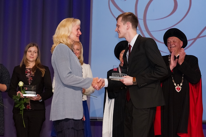 Velgai Gaļanskai RSU Gada balvu nominācijā "Gada docētājs" pasniedz Studējošo pašpārvaldes priekšsēdētājs Artūrs Kaļva. RSU 65 gadu jubilejas Senāta svinīgā sēde 2015. gada 18. septembrī RSU aulā.