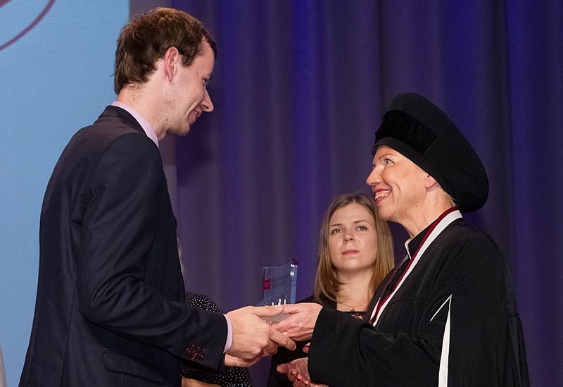 No labās: RSU mācību prorektore Tatjana Koķe pasniedz RSU Gada balvu nominācijā "Gada doktorants" Edijam Vāveram 2015. gada 18. septembrī RSU aulā Senāta svinīgajā sēdē.
