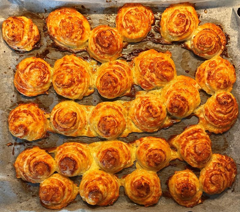 - Izrullēto mīklu ieziež ar mīksto sviestu un pārkaisa ar sarīvēto sieru. Tad mīklu sarullē garā ruletē un sagriež lielākos vai mazākos gabalos pēc sirds patikas.