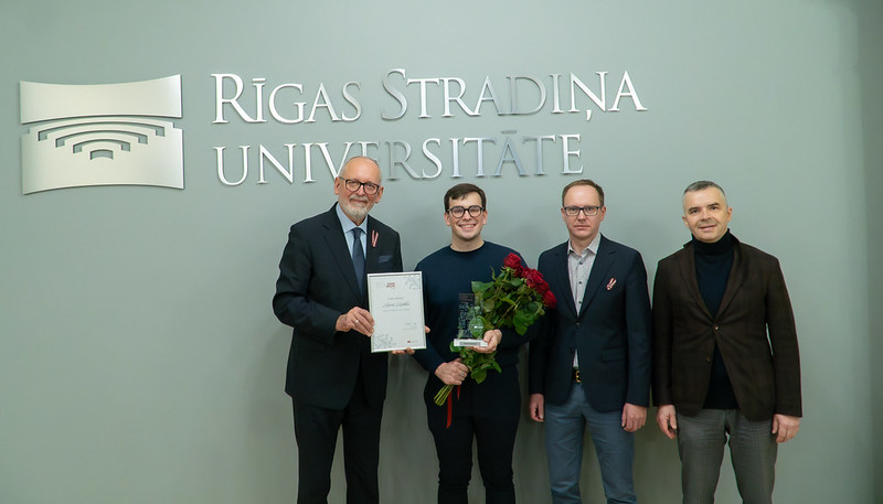 Tā kā prakses dēļ Roberts septembrī uz Akadēmisko balli, kur pasniedz RSU Gada balvas, netika, universitātes vadība balvu viņam pasniedza 22. novembrī. No kreisās: RSU rektors Aigars Pētersons, Roberts Kārkliņš, veselības studiju prorektors Andris Skride un prorektors akadēmiskajā darbā Dins Šmits