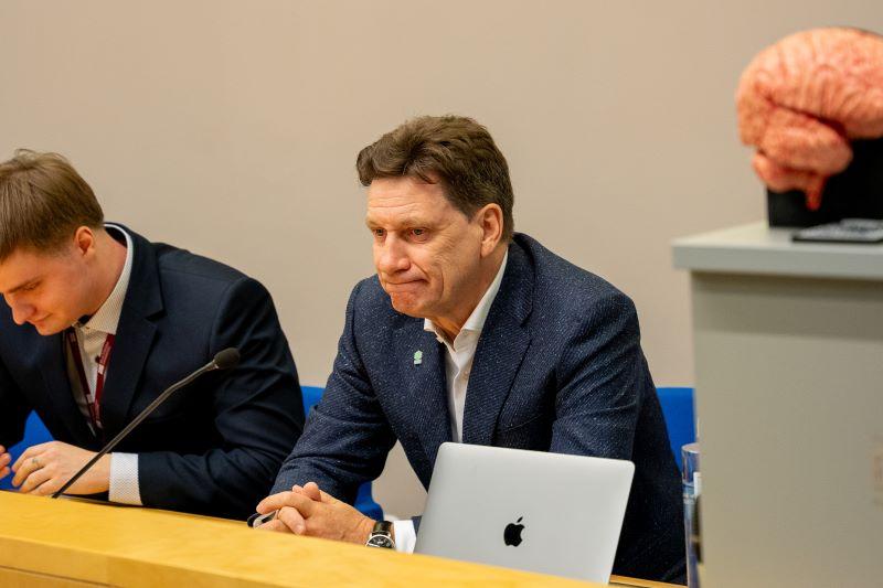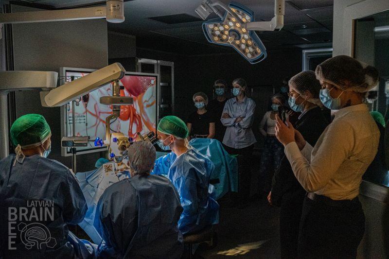 Darba grupās skolēni apguva kardiopulmonālo reanimāciju, uzzināja, kā veic lumbālpunkciju, un ieskatījās neiroķirurģiskās operācijas aneirismas klipēšanas gaitā.