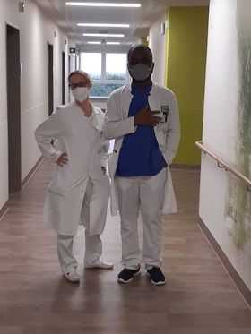 Izabella Kristīna Maijere-Tešendorfa kopā ar kolēģi Svētā Bernarda klīnikā. Foto no privātā arhīva