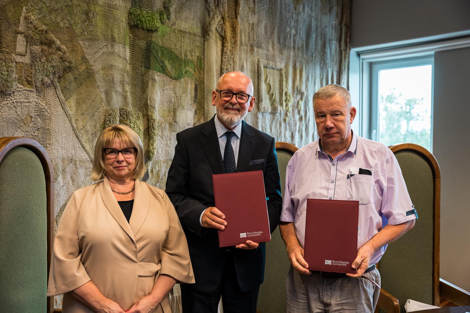 RSU Sarkanā Krusta medicīnas koledžas direktore Ināra Upmale, RSU rektors Aigars Pētersons un Latvijas Sarkanā Krusta valdes priekšsēdētājs Uldis Līkops