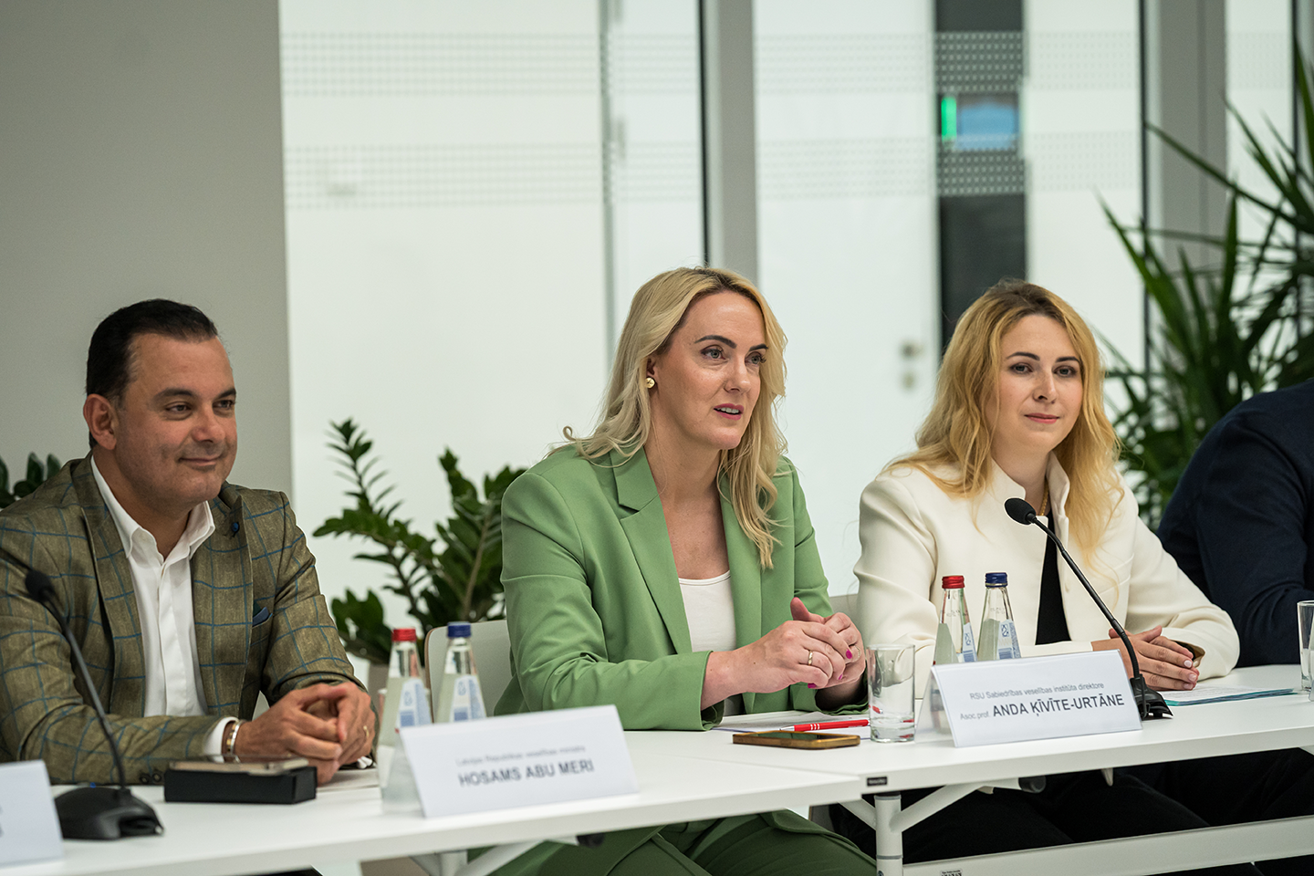 Pētījuma rezultātu prezentācija Rīgas Stradiņa universitātē. No kreisās: veselības ministrs Hosams Abu Meri, pētījuma autores RSU Sabiedrības veselības institūta direktore Anda Ķīvīte-Urtāne un vecākā laborante Ļubova Tihomirova