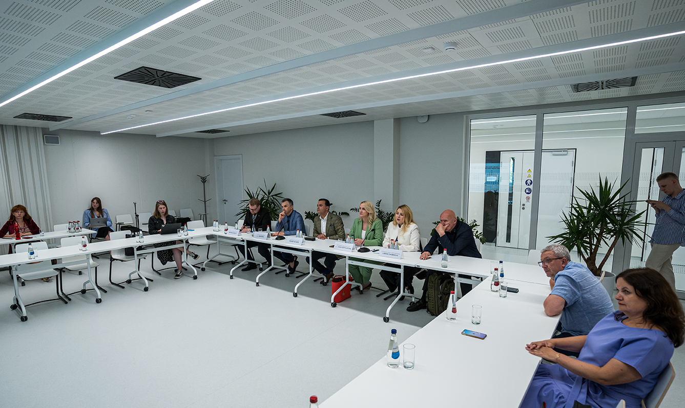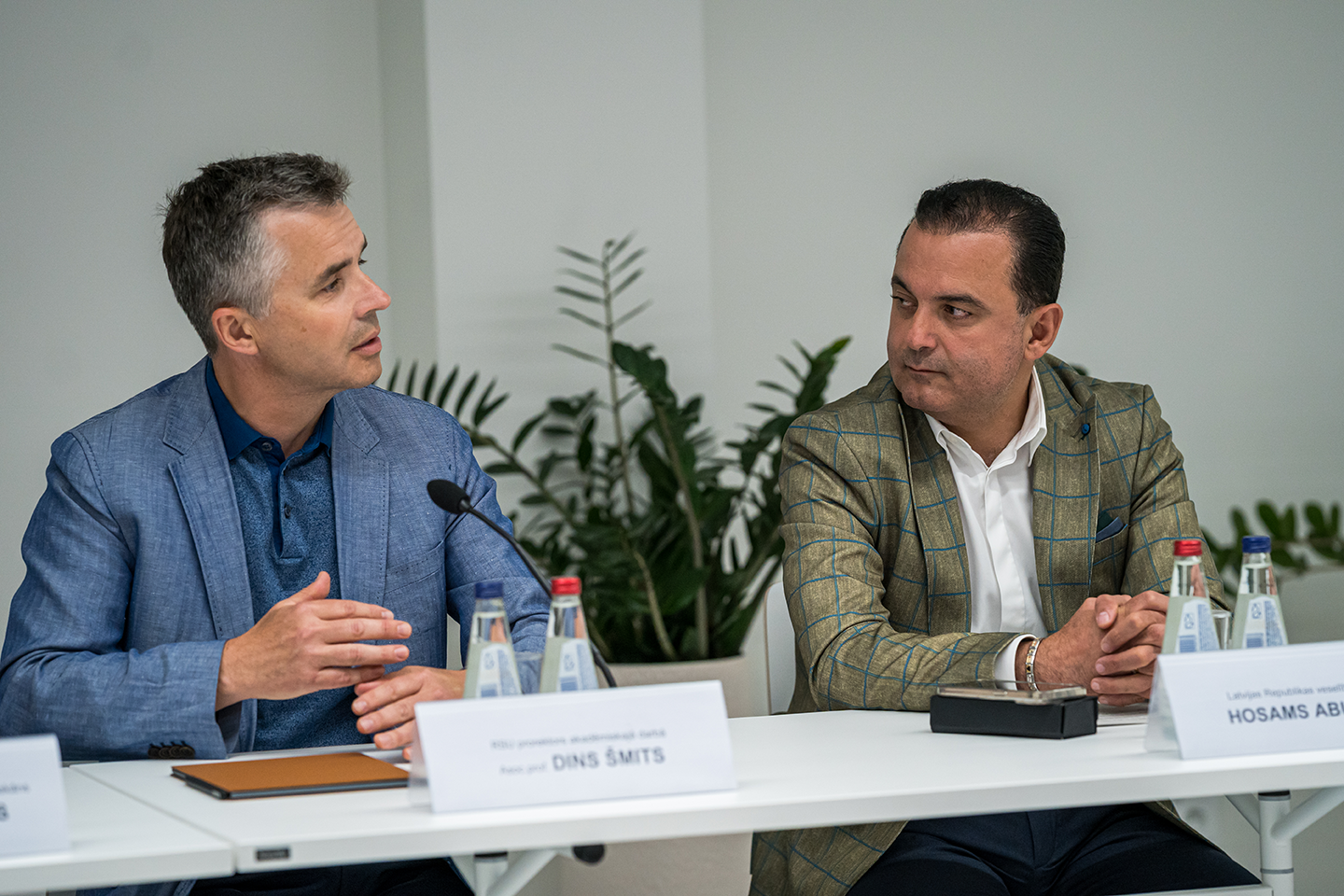 RSU prorektors akadēmiskajā darbā Dins Šmits (no kreisās) un veselības ministrs Hosams Abu Meri pētījuma prezentācijas laikā