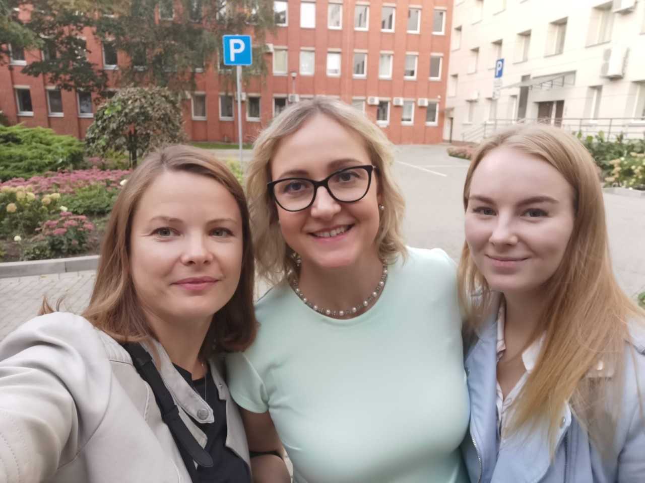 Latvijas ginekologu un dzemdību speciālistu asociācijas prezidente dr. Vija Veisa (no kreisās) smaida pēc intervijas ar RSU pētniecēm dr. Ievu Briedīti un studenti Darju Mihailovu.
