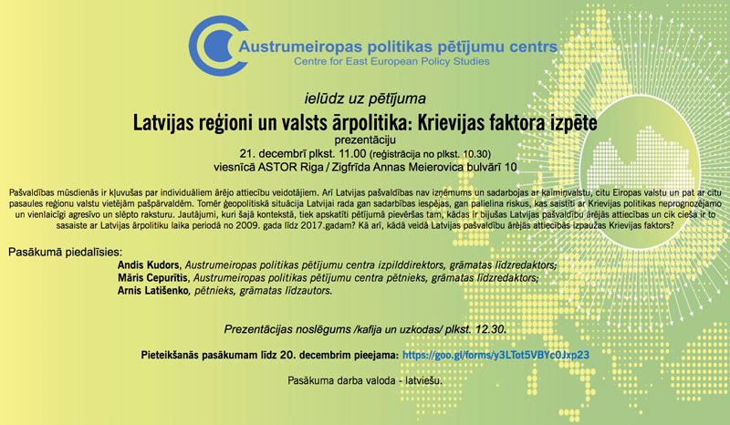 Austrumeiropas politikas pētījumu centrs 21. decembrī plkst. 11.00 ielūdz uz pētījuma Latvijas reģioni un valsts ārpolitika: Krievijas faktora izpēte prezentācijas pasākumu, kas notiks viesnīcā Astor Riga. Pētījumā piedalās Rīgas Stradiņa universitātes (RSU) lektors un studiju programmas Starptautiskās attiecības – Eiropas studijas vadītājs Māris Cepurītis, RSU absolventi Agita Briča un Mārcis Balodis, kā arī RSU maģistrantūras students Arnis Latišenko.