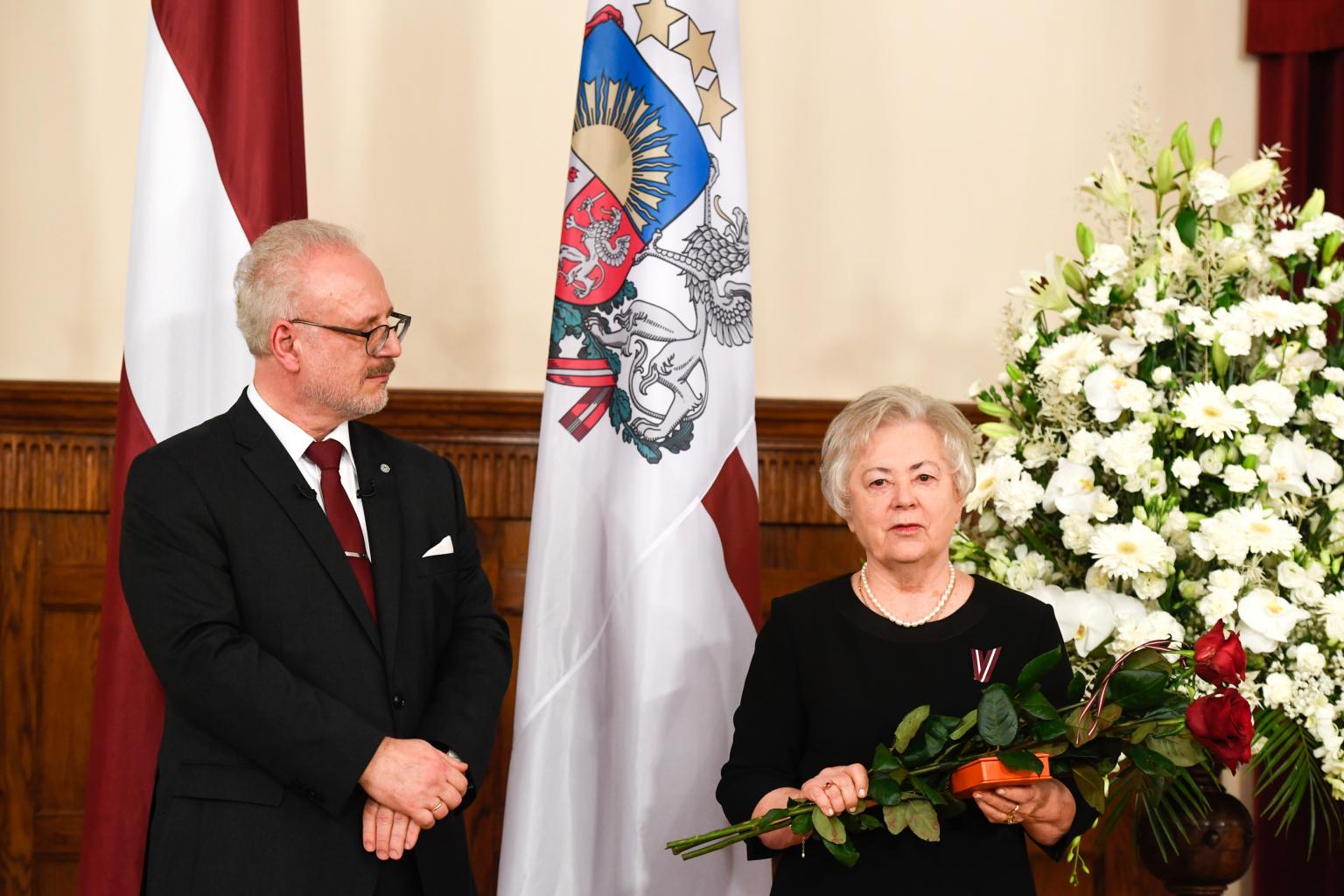 No kreisās: Valsts prezidents Egils Levits un Atzinības krusta kavaliere – ilggadējā RSU Zobārstniecības fakultātes Zobu terapijas un mutes veselības katedras prof. Rūta Care. Foto: Ilmārs Znotiņš, Valsts prezidenta kanceleja
