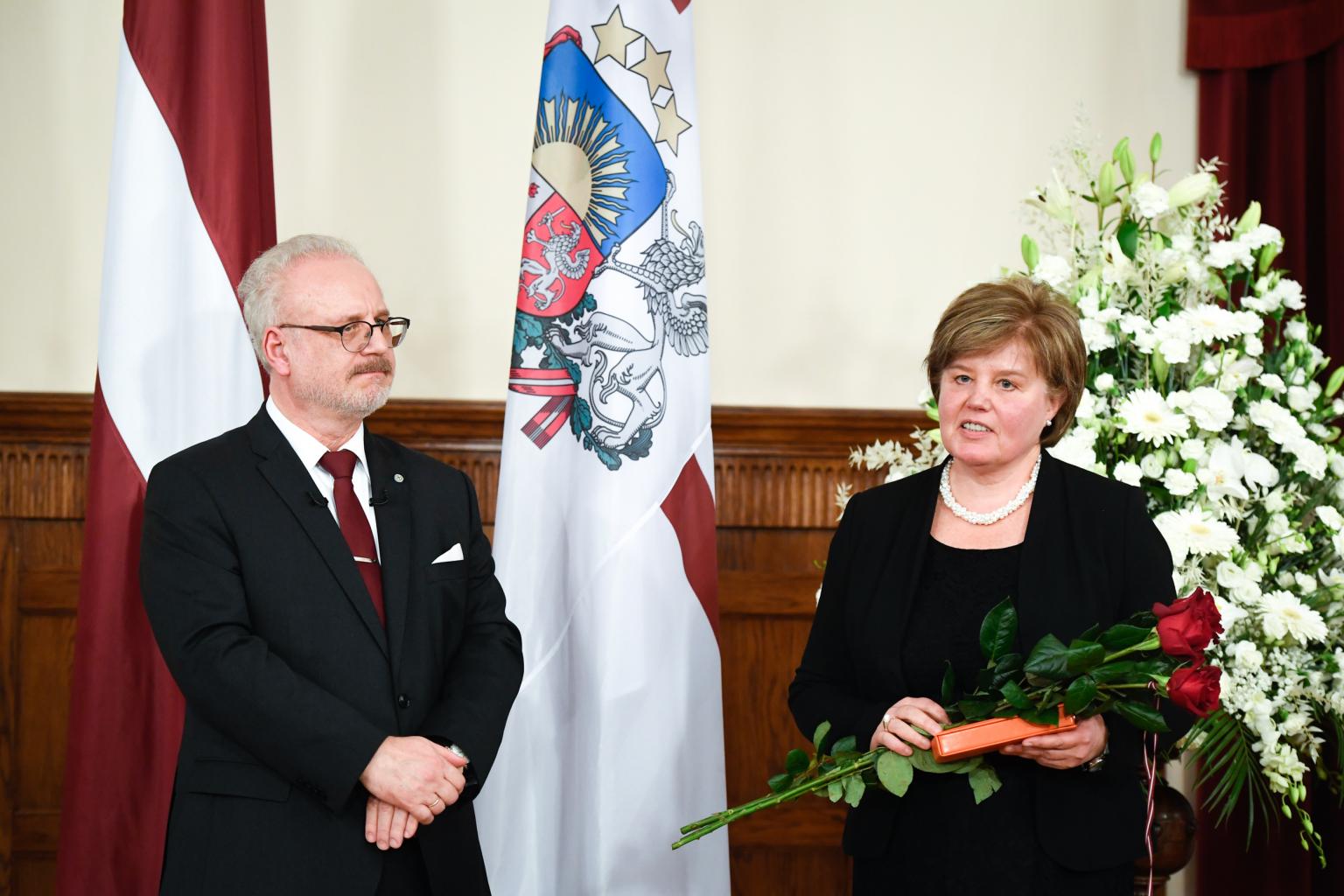 No kreisās: Valsts prezidents Egils Levits un Atzinības krusta virsniece – RSU Sabiedrības veselības un sociālās labklājības fakultātes dekāne prof. Inga Millere. Foto: Ilmārs Znotiņš, Valsts prezidenta kanceleja