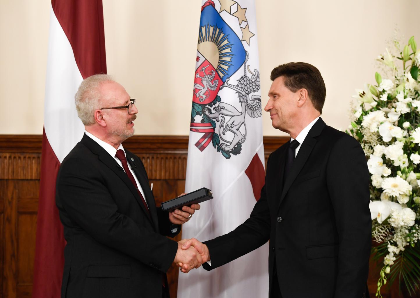 No kreisās: Valsts prezidents Egils Levits un Triju Zvaigžņu ordeņa virsnieks – RSU Medicīnas fakultātes Neiroloģijas un neiroķirurģijas katedras vadītājs prof. Andrejs Millers. Foto: Ilmārs Znotiņš, Valsts prezidenta kanceleja