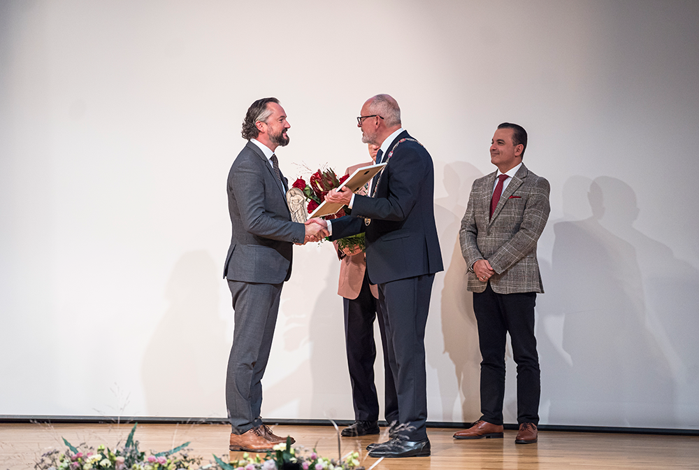 RSU rektors prof. Aigars Pētersons pasniedz balvu prof. Harldam Plaudim