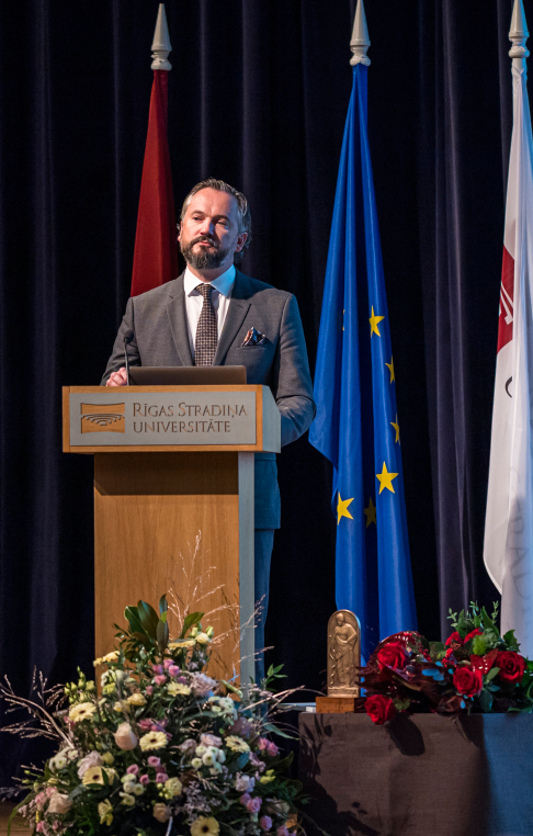 Profesors Haralds Plaudis saka akadēmisko runu balvas pasniegšanas ceremonijā