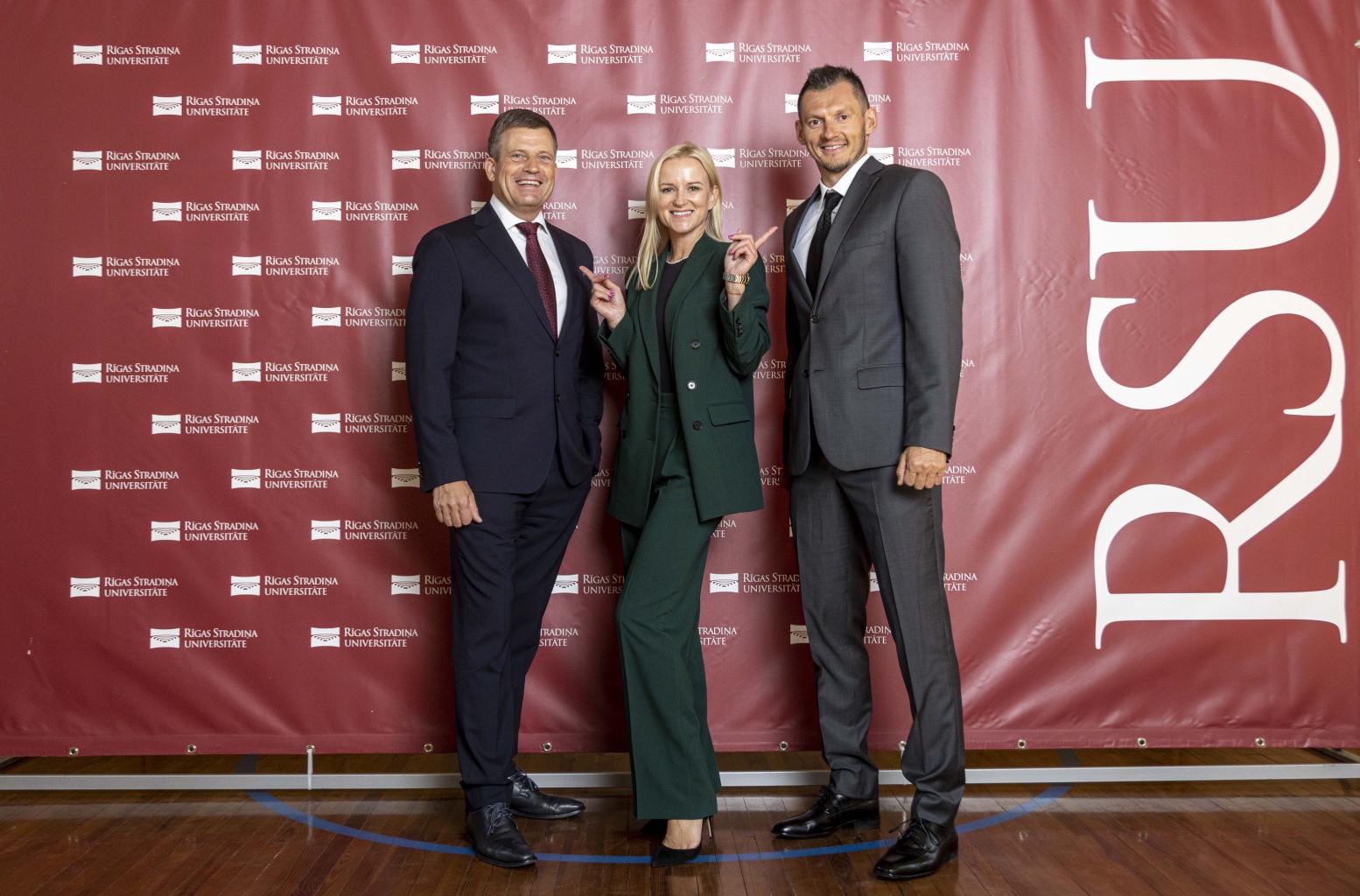 No kreisās: RSU administrācijas un attīstības prorektors Toms Baumanis, Laura Ritova un "VEF Rīga" padomes priekšsēdētājs, ilggadējais Latvijas basketbola izlases kapteinis Jānis Blūms