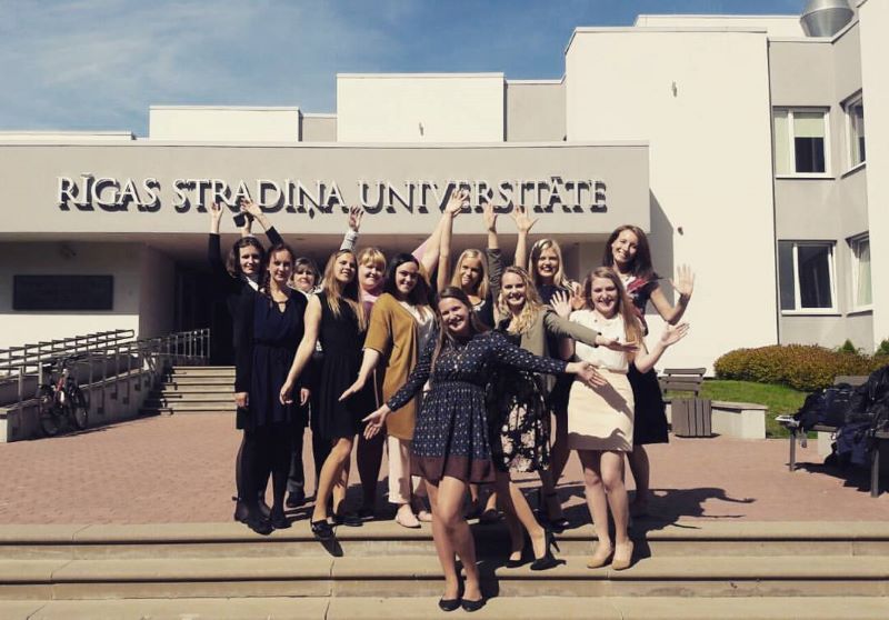 2017. gads. Janeta (trešajā rindā otrā no labās) kopā ar kursabiedrenēm pēc bakalaura darba aizstāvēšanas. Pie RSU Medicīnas izglītības tehnoloģiju centra. Foto no privātā arhīva