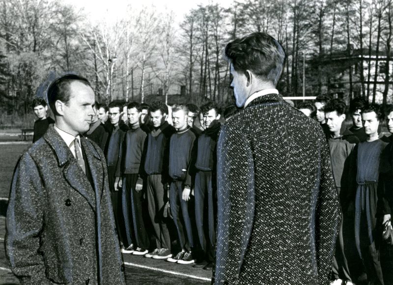 Pasniedzējs Banga Lokomotīves stadionā (tagad – Arkādijas stadions) ziņo mācību prorektoram Vladislavam Korzānam, ka Rīgas Medicīnas institūta VIII spartakiādes dalībnieki nostādīti ierindā. No RSU muzeja krājuma: 1961. gada 31. oktobra Rīgas Medicīnas institūta laikraksta "Padomju Mediķis" foto