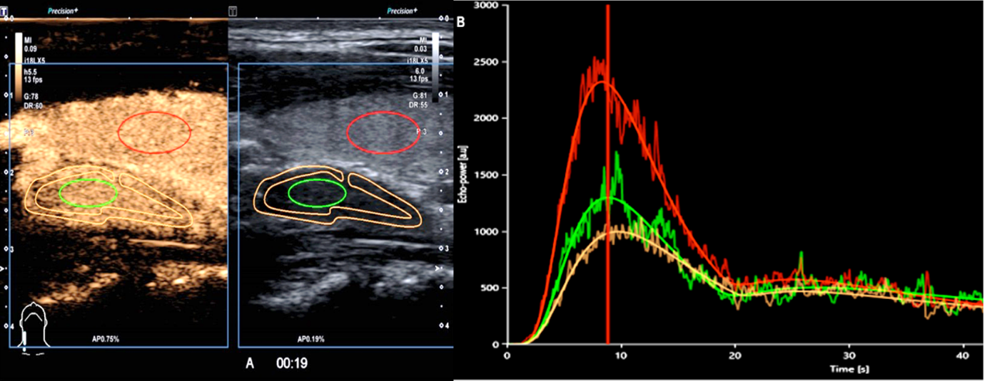 pacientam caur venozo katetru ievada kontrastvielu, ar ultrasonogrāfiju pēta kontrastvielas krāšanos un izskalošanos no epitēlijķermenīšiem, lai varētu raksturot veidojuma tipu.