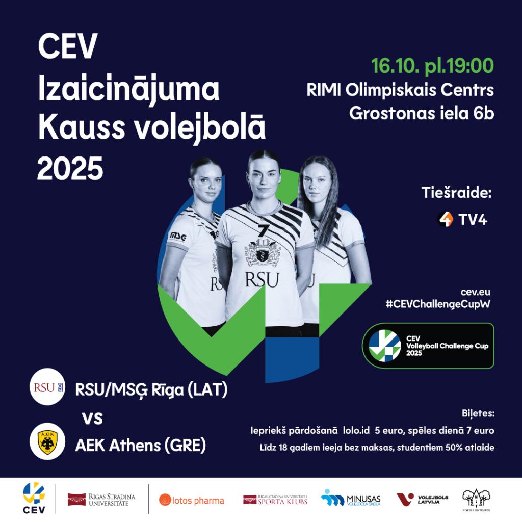 Aizraujošā un emocijām bagātā pirmajā CEV Izaicinājuma kausa spēlē pret AEK Athens (Grieķija) RSU/MSĢ piedzīvoja zaudējumu (1:3). Jau trešdien, 16. oktobrī, plkst. 19 Latvijas volejbola faniem un sporta līdzjutējiem būs lieliska iespēja RIMI Olimpiskajā centrā baudīt klātienē nākamo pirmās kārtas spēli, kurā RSU/MSĢ volejbolistes centīsies revanšēties.