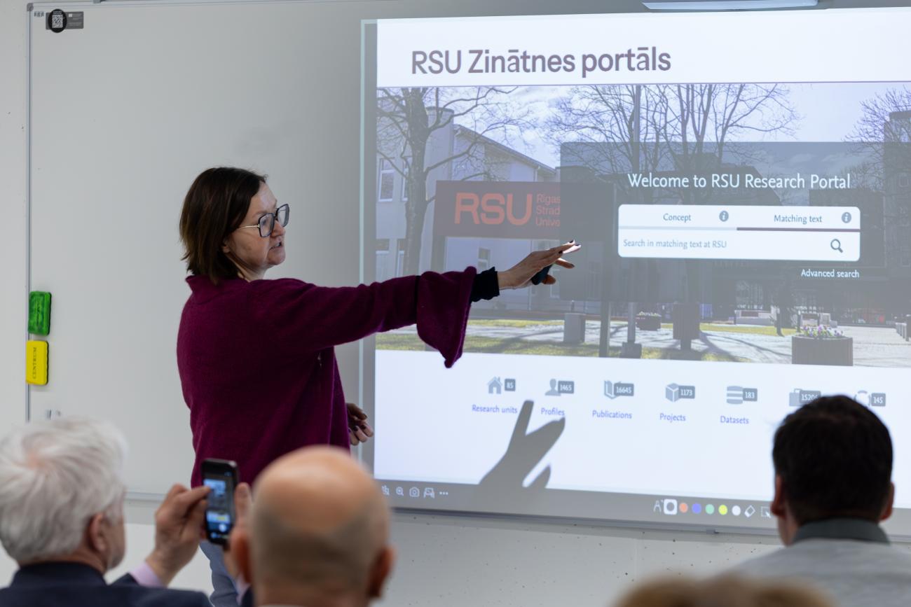 RSU zinātņu prorektore Agrita Kiopa iepazīstināja ar universitātes pētniecības ekosistēmu un izcēla tās starptautisko mērogu – vairāk nekā 12 400 studentu, tostarp 3146 ārvalstu studenti no 87 valstīm, vairāk nekā 250 doktorantu, sešas koplietošanas pētniecības platformas un specializēti pētniecības centri, tostarp Veselības aprūpes sportā izpētes centrs.