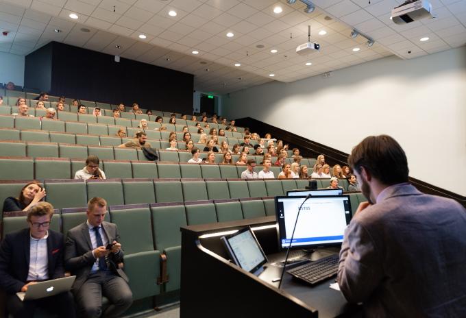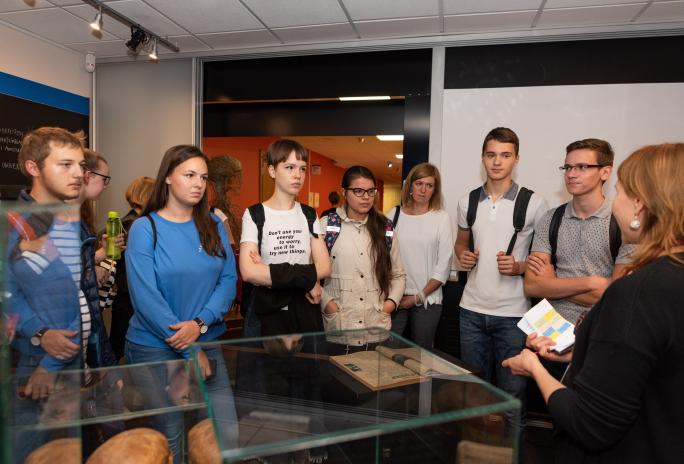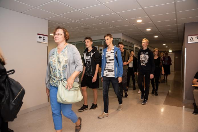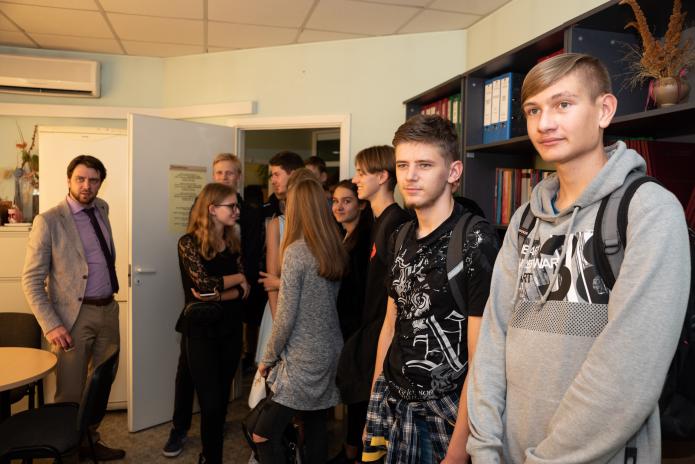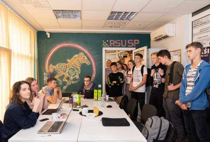 Starptautiskā biznesa un ekonomikas katedras docents Romāns Putāns pastāstīja par sociālo zinātņu programmām un plānotajām vieslekcijām, kā arī atraktīvā veidā, izmantojot interaktīvu vietni viedtālrunī, palīdzēja skolēniem labāk izprast augstskolas būtību un prasības. Sekoja tuvāka skolēnu iepazīšanās ar RSU Eiropas studiju fakultāti, Studējošo pašpārvaldi, Zobārstniecības pirmsklīniku un RSU muzeju, bet noslēgumā skolēni baudīja kliņģeri.