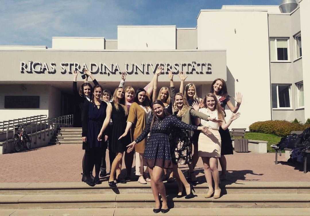 Kopā ar kursabiedrenēm pie RSU Medicīnas izglītības tehnoloģiju centra, kur notiek lielākā daļa studiju programmas "Sociālais darbs" lekciju un nodarbību. Monta Bērze – priekšplānā pa vidu. Foto no privātā arhīva