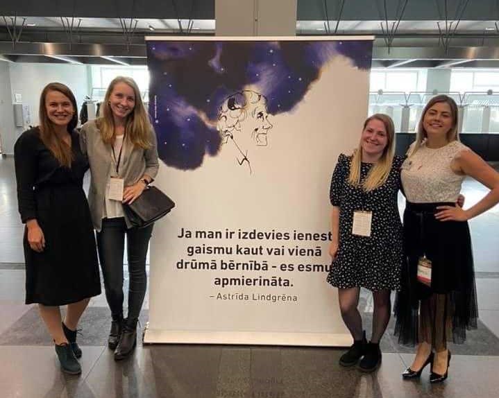 Sociālajiem darbiniekiem visu laiku, tāpat kā ārstiem un skolotājiem, ir jāpapildina savas zināšanas. RSU absolventes, bijušās kursabiedrenes satikušās centra "Dardedze" rīkotajā konferencē "Aizej tur – nezin kur? Ceļa meklējumi vardarbības pret bērnu novēršanai" Nacionālajā bibliotēkā 2020. gadā. No kreisās: Monta Bērze, Kristiāna Kaminska, Jana Zīle un Janeta Bokaldere. Foto no privātā arhīva