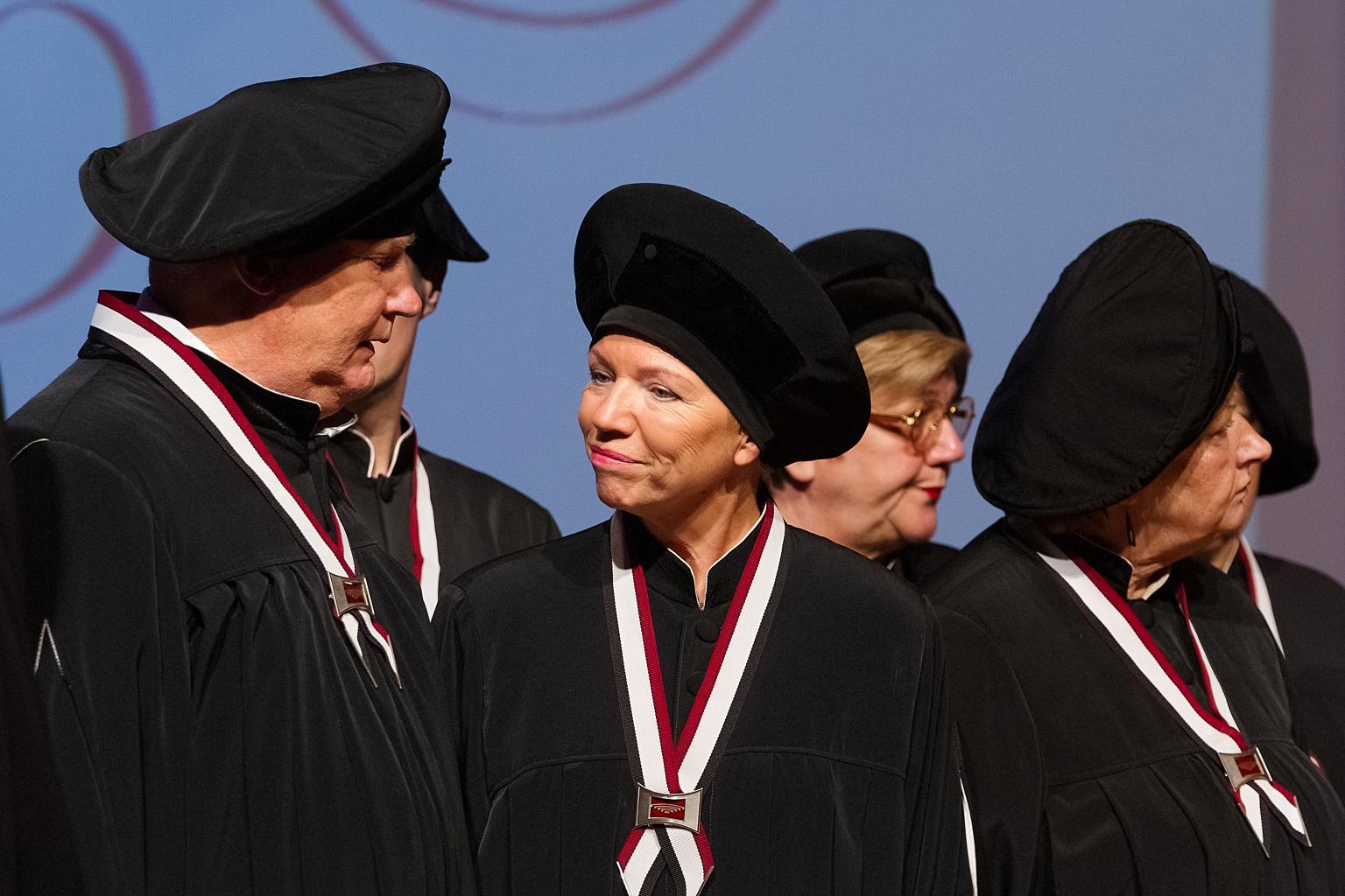 Prof. Tatjana Koķe (centrā) 2015. gada 18. septembrī aulā uz skatuves RSU 65 gadu jubilejas Senāta svinīgajā sēdē