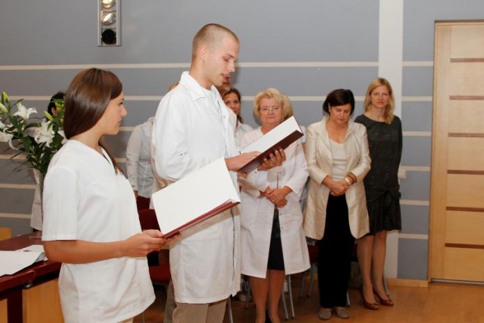 Visiem pieceļoties un stāvot kājās, topošā zobārsta solījumu latviski un angliski nolasīja kursu vecākie, tad katrs no studentiem parakstījās īpašajā solījuma grāmatā un saņēma no fakultātes dekānes nelielu dāvaniņu.
