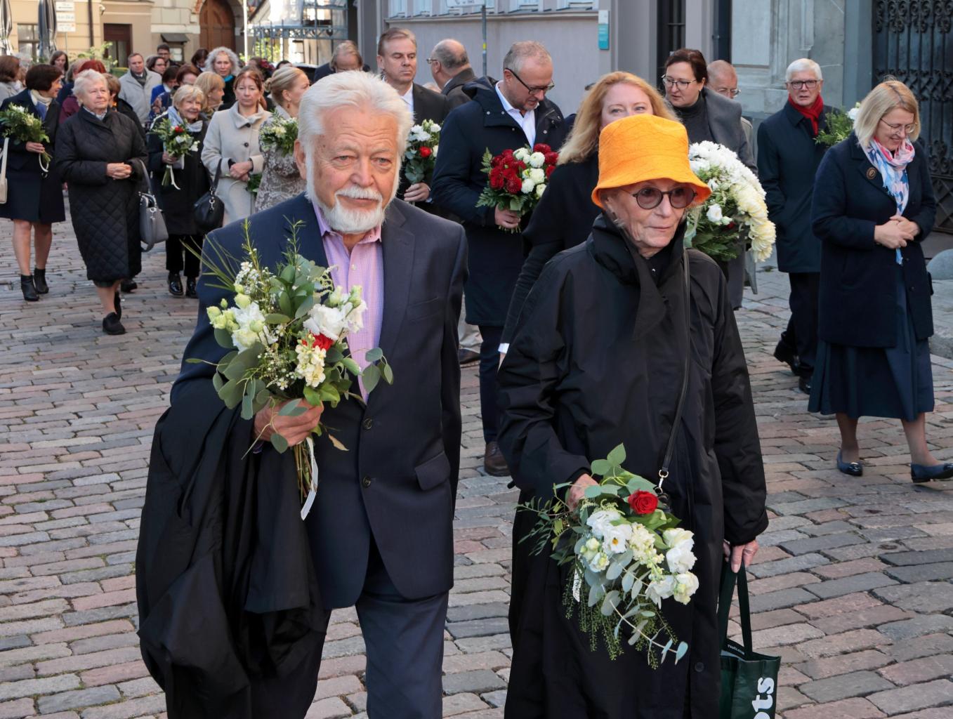 Ojāra Veides Fonda vadītājs prof. Kaspars Tūters kopā ar dzīvesbiedri 9. Latvijas ārstu kongresa dalībnieku gājienā caur Vecrīgu 21.09.2022. Foto: Jānis Brencis