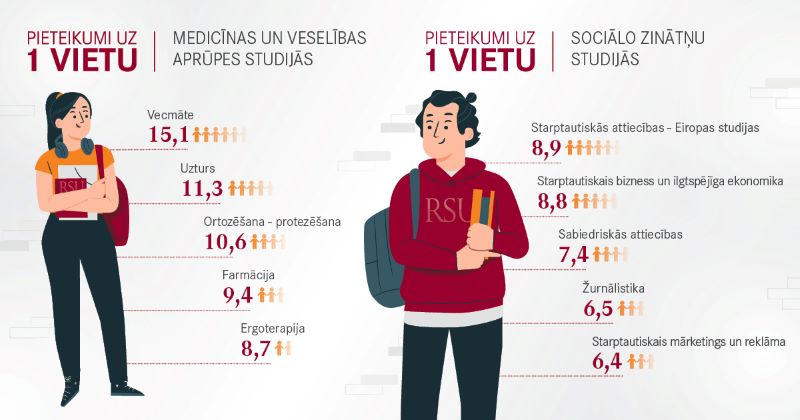 Līdzīgi kā iepriekš, arī šogad visvairāk studētgribētāju ir programmā Medicīna, kur saņemts 1591 pieteikums (pērn 1400). Tas ir augstākais rādītājs programmas pastāvēšanas laikā. Liela interese topošajiem studentiem ir arī par programmām Vecmāte (15,1 pieteikums uz vienu vietu), Uzturs (11,3 pieteikumi uz vienu vietu), Ortozēšana, protezēšana (10,6 pieteikumi uz vienu vietu), Farmācija (9,4 pieteikumi uz vienu vietu), kā arī Ergoterapija un Fizioterapija attiecīgi ar 8,7 un 7,2 pieteikumiem uz vienu vietu.