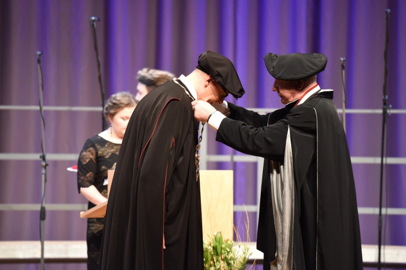 Pēc tam, kad RSU Senāta priekšsēdētājs prof. Andrejs Vilks nolasīja RSU Satversmes sapulces 2017. gada 9. novembrī pieņemto lēmumu par rektora ievēlēšanu un Ministru kabineta 2017. gada 13. decembra sēdes rīkojumu par RSU rektora apstiprināšanu un uzlika prof. Aigaram Pētersonam ap kaklu rektora amata ķēdi, Aigars Pētersons gandrīz 500 klātesošajiem deva svinīgo rektora solījumu, sākot to šādi: "Es, Aigars Pētersons, uzņemoties Rīgas Stradiņa universitātes rektora amata pienākumus, svinīgi solu, ka viss mans darbs būs veltīts Rīgas Stradiņa universitātes attīstībai un izaugsmei. [..]"