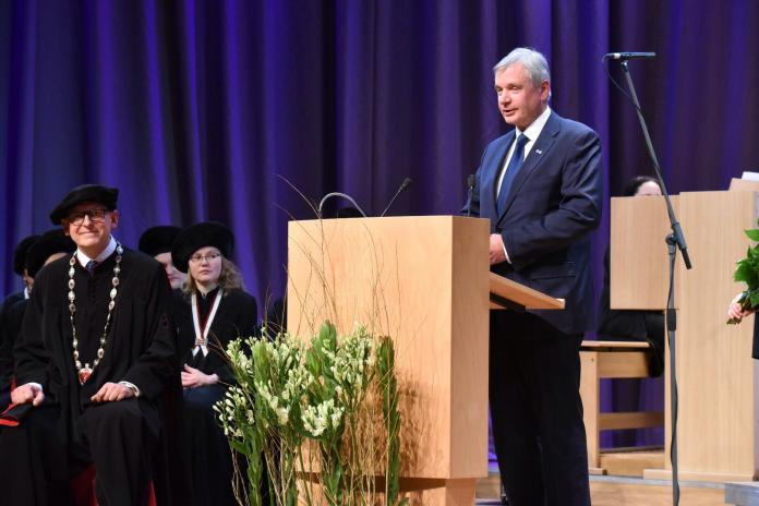 Pēc akadēmiskās svinību dziesmas Gaudeamus igitur uzrunu teica prof. Jānis Gardovskis, kurš bija RSU rektors no 2008. gada 1. janvāra līdz 2017. gada 31. decembrim. Viņš pieminēja paveikto šajos desmit gados un pateicās visam RSU kolektīvam par darbu un sadarbību. Jaunajam rektoram profesors novēlēja arī turpmāk izvirzīt "lielus mērķus, jo tikai tā var tikt uz priekšu, un labu veselību".