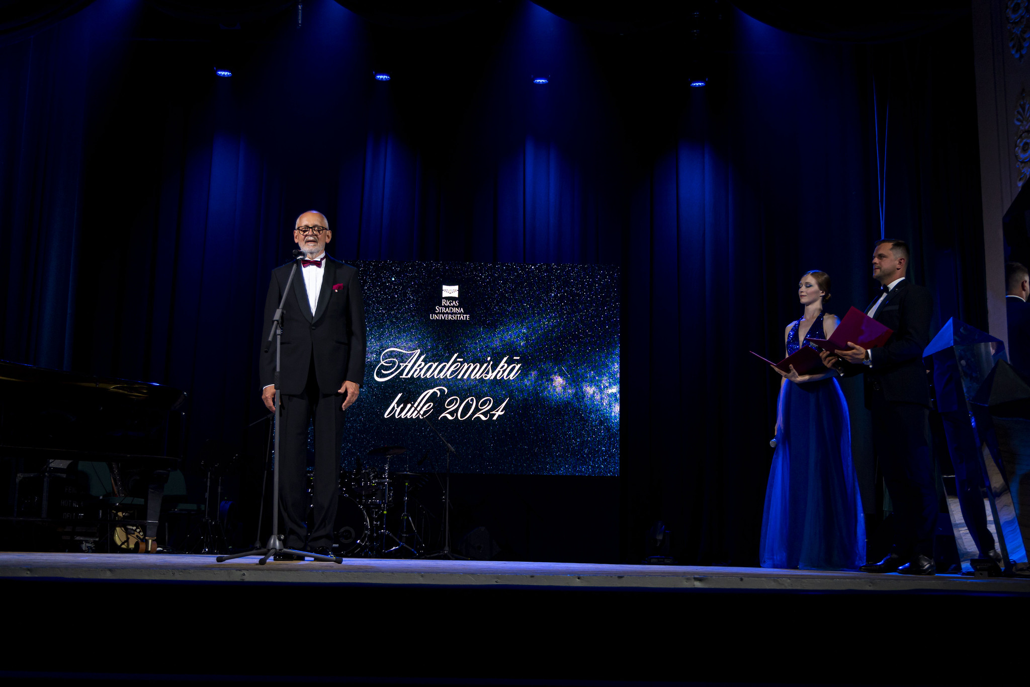 | RSU rektors prof. Aigars Pētersons uzrunā klātesošos Akadēmiskajā ballē 2024 |