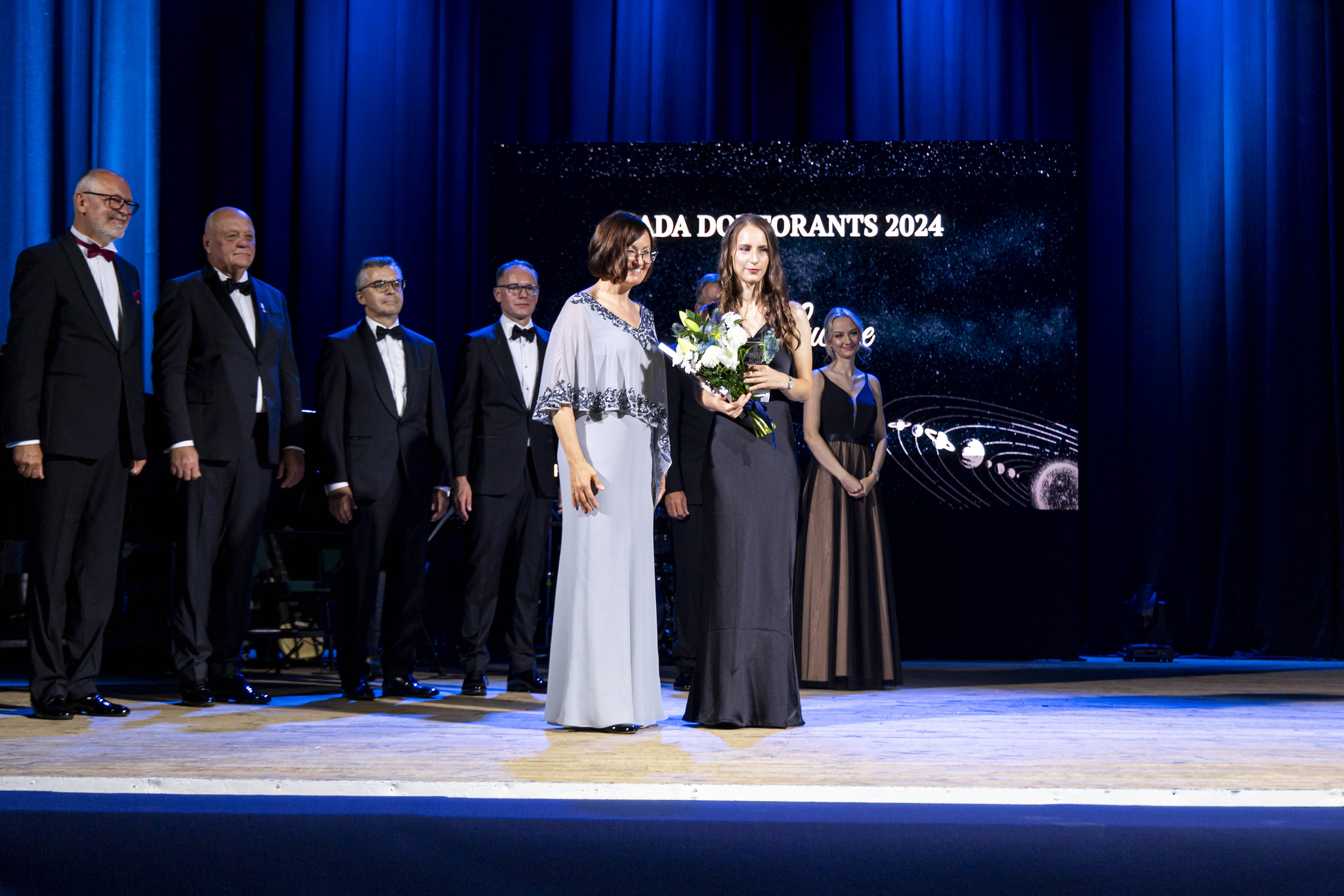 | RSU Akadēmiskā balle 2024. Zinātņu prorektore Agrita Kiopa (no kreisās) pasniedz Gada doktoranta balvu Zanei Lucānei |