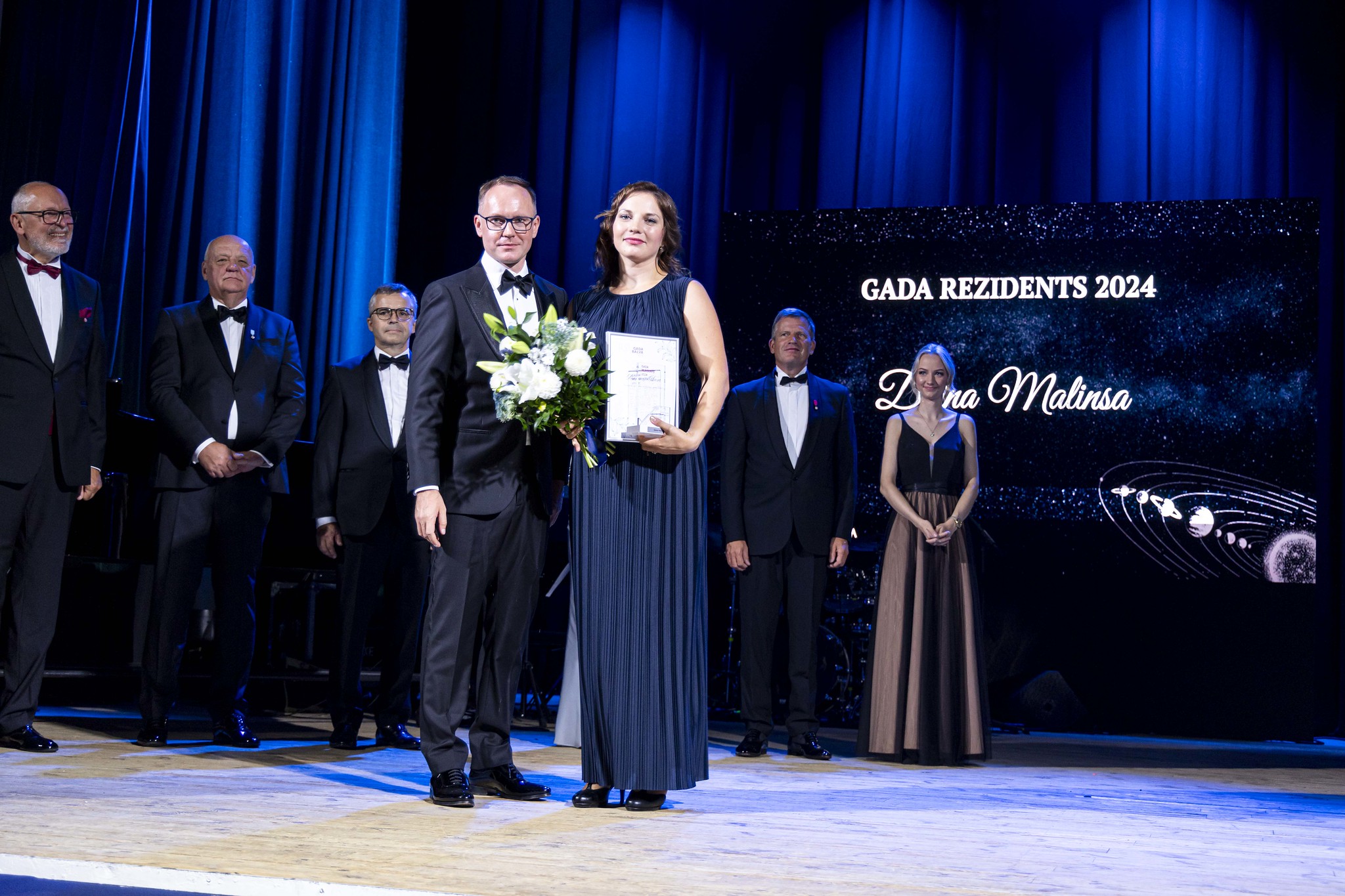 | RSU Akadēmiskā balle 2024. Veselības studiju prorektors asoc. prof. Andris Skride pasniedz Gada rezidenta balvu Dainai Malinsai |