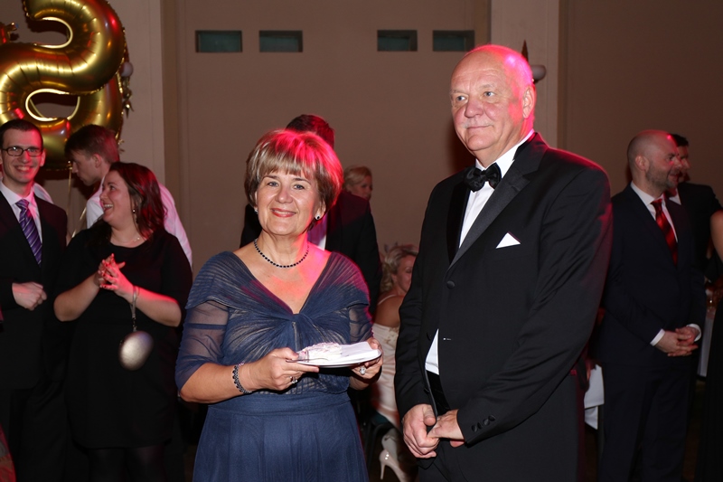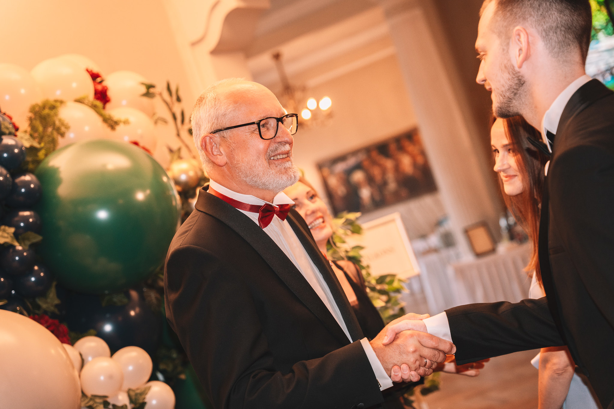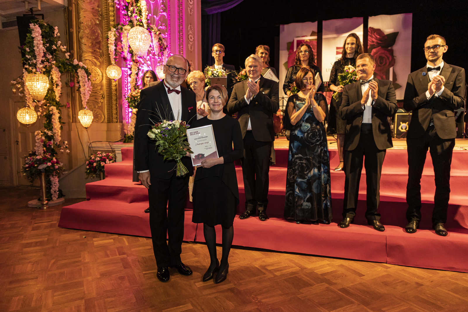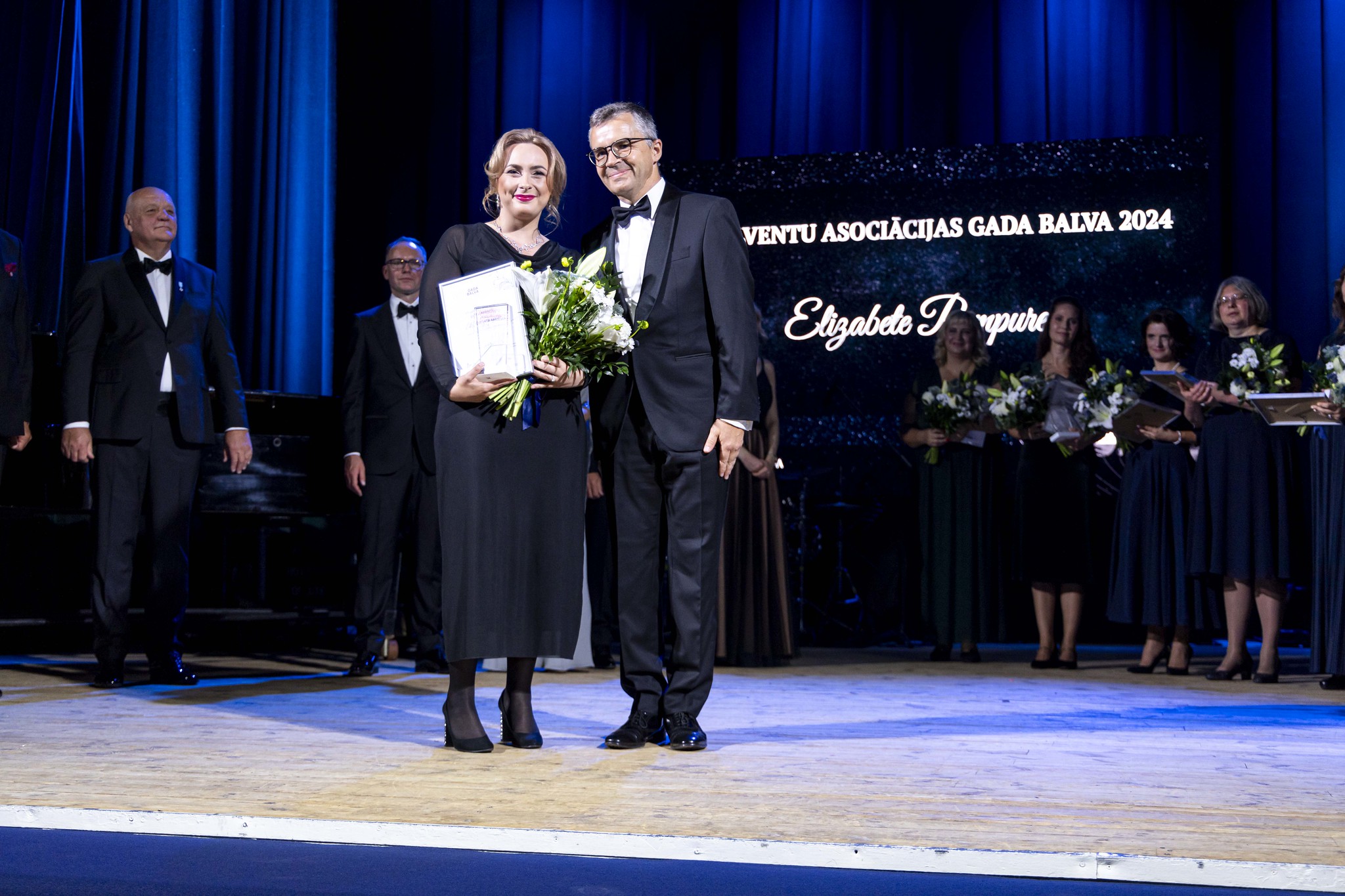 | RSU Akadēmiskā balle 2024. Prorektors akadēmiskajā darbā, Absolventu asociācijas valdes priekšsēdētājs asoc. prof. Dinš Šmits pasniedz Absolventu asociācijas balvu RSU docētājai, ginekoloģei un dzemdību speciālistei Elizabetei Pumpurei. |