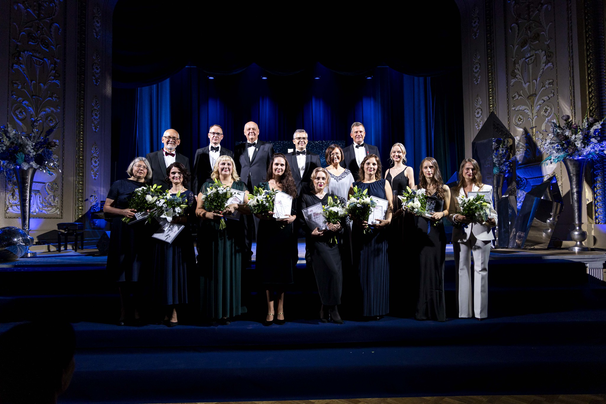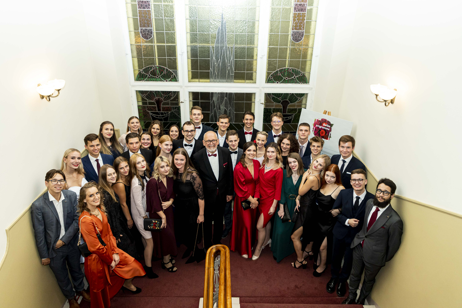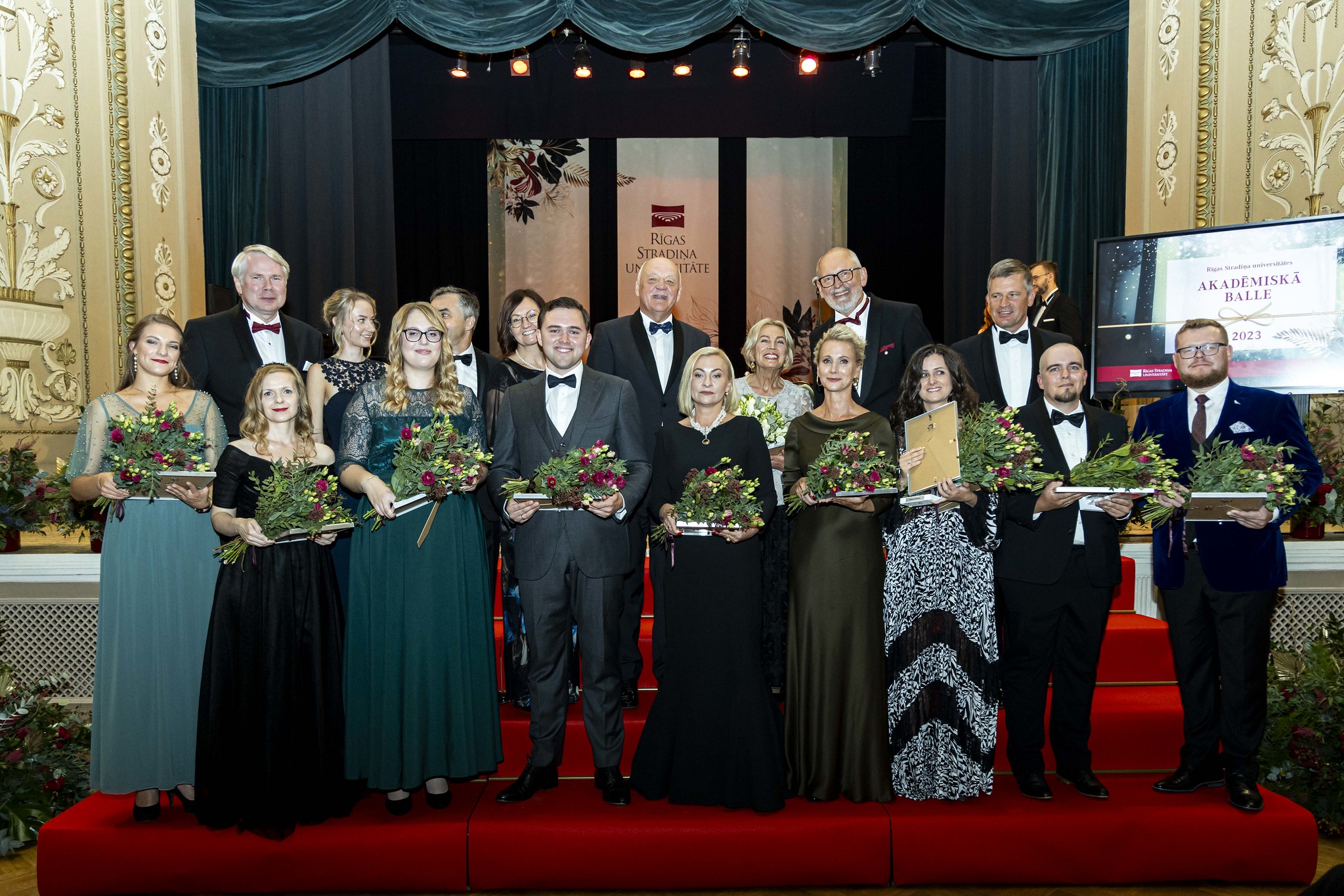 | RSU Akadēmiskā balle 2024. Balvu saņēmēji (pirmajā rindā) kopā ar RSU vadību |