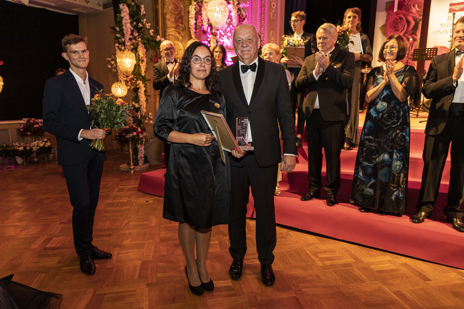 | RSU Akadēmiskā balle 2024. Senāta priekšsēdētājs prof. Jānis Gardovskis pasniedz Gada zinātnieka balvu Madarai Auzenbahai |