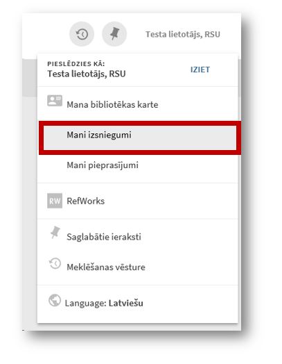 Pēc tam, atveroties Primo meklētājam, lapas labajā pusē spiediet uz pogas "Ienākt" un ievadiet savu RSU studējošā e-pastu un paroli. Tad spiediet uz lietotāja izvēlnes un Mani izsniegumi, tieši tā kā norādīts ekrānšāviņā