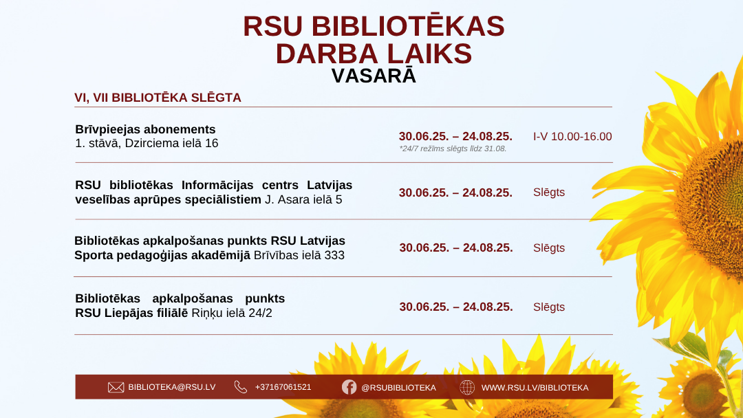 VI, VII slēgts - Bibliotēkas apkalpošanas punkts RSU Latvijas Sporta pedagoģijas akadēmijā